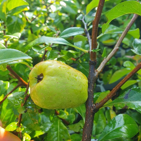 Owoce: Owoce są twarde, o nieregularnym, nieco jabłkowatym kształcie. Ich skórka zmienia kolor z zielonego na intensywnie żółty/pomarańczowy w miarę dojrzewania. Na powierzchni widoczne są drobne, ciemniejsze cętki. Owoce gęsto oblepiają długie gałązki. Miąższ jest zwarty, suchy i twardy. W centralnej części znajduje się wyraźne, pięcioramienne gniazdo nasienne wypełnione licznymi, ciemnobrązowymi nasionami. Owoce dojrzewają od września do października.