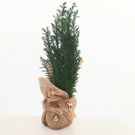 Cyprysik miaturka to zimozielona choinka, która ozdobi każdą przestrzeń. Cyprysik, wspaniale sprawdzi się w naszych domach lub przed drzwiami jako zimowa świąteczna aranżacja. Dzięki swoim niewielkim rozmiarom pięknie uzupełni świąteczne, ozdobne kompozycje w mieszkaniach. Świetnie sprawdzi się również na zewnątrz zdobiąc parapety, balkony i tarasy. Dorasta do 30-50 cm. Sadzonka ozdobiona w jutę i dekorację drewniane.