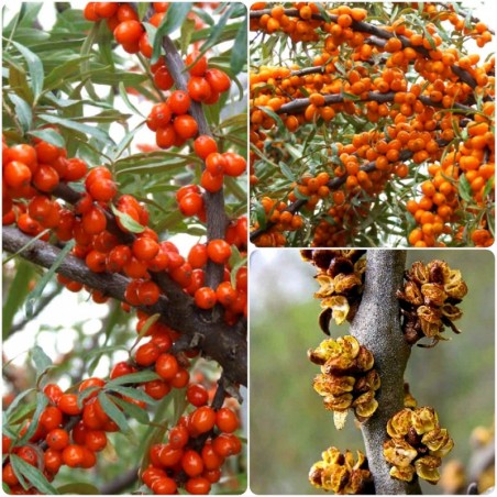 Opis ogólny: Pakiet składa się z żeńskiego rokitnika Aromatnaja i Podarok Sadu oraz niezbędnego do ich owocowania Rokitnika Hikul.