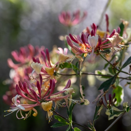 Opis ogólny: Wiciokrzew pomorski Harlequin zwany też Sherlite to szybko rosnące pnącze, które osiąga maksymalnie 4m wysokości. Odmiana wyselekcjonowana przez O. Messengera w 1994 roku, a wprowadzona do handlu przez John Woods Nurseries Limited, Anglia w 1995 roku. Wiciokrzew ten świetnie będzie wyglądał posadzony przy podporach ażurowych, kratkach, siatkach czy pergolach. Może służyć jako roślina przydomowa a także do nasadzeń osiedlowych.
