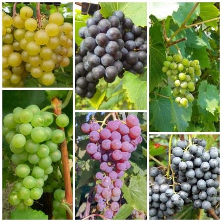 Opis ogólny: Pakiet winorośli składający się z winorośli jasnej Refren, Supaga, Bianca, winorośli ciemnej Alwood i Agat Doński oraz winorośli różowej bezpestkowej Reliance.